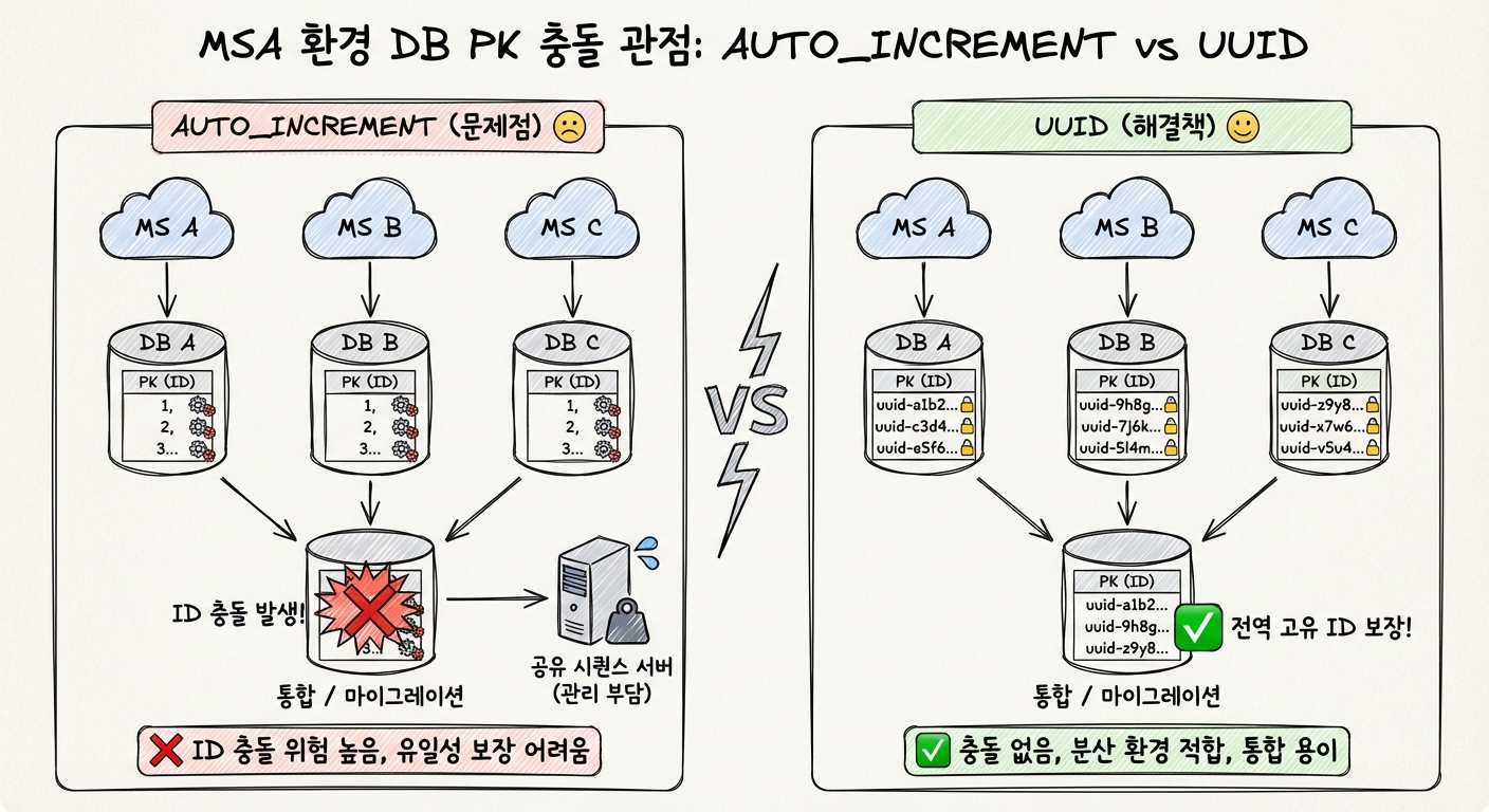 서비스 규모가 커지며 MSA(Microservices Architecture) 환경으로 전환하면, 각 서비스는 자신만의 데이터베이스를 가집니다. 이때 AUTO_INCREMENT를 사용하면 서비스 간 데이터 통합이나 마이그레이션 시 ID 충돌이 발생할 위험이 크며, 전역적으로 고유한 ID를 생성하기 위해 별도의 공유 시퀀스 서버를 운영해야 하는 관리 부담이 생깁니다.