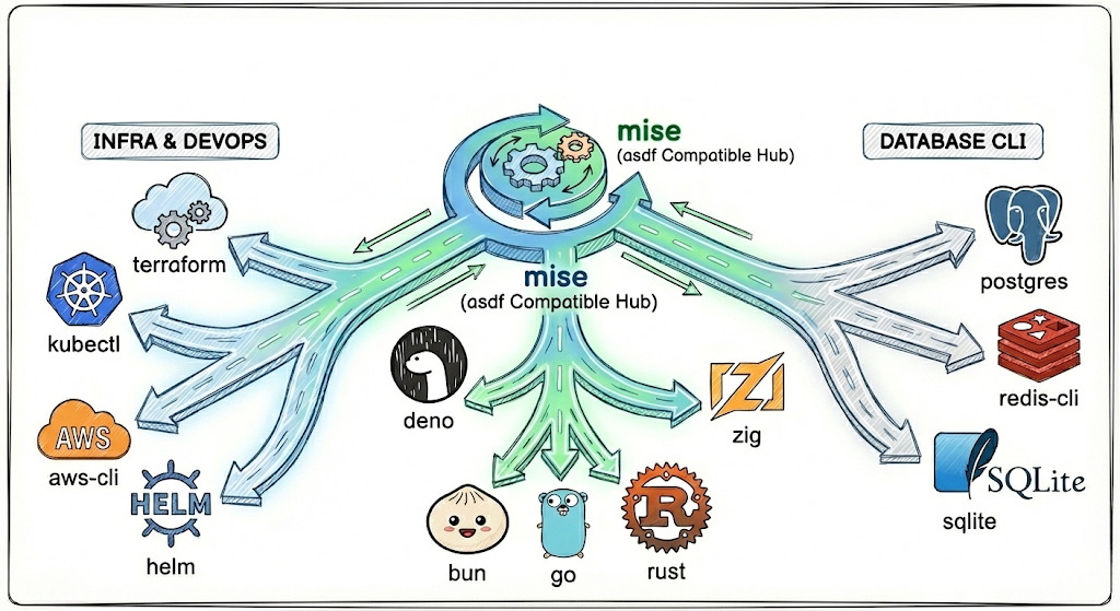 mise는 단순히 런타임(Node, Java, Python)에 그치지 않고, 개발 워크플로우에 필요한 거의 모든 CLI 도구를 관리할 수 있습니다. asdf 플러그인 생태계와 100% 호환되기 때문입니다.