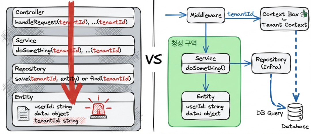 이때 개발자들은 구현 단계에서 고민되는 지점이 생기고 실수를 할 수 있습니다. 바로 테넌트 격리라는 기술적 제약을 비즈니스 로직 안으로 끌어들이는 것입니다.